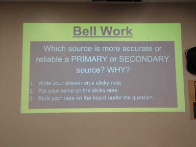 I started my day today (after two snow days) with this task focused on the question... "Which source is more accurate or reliable a PRIMARY source or a SECONDARY source?